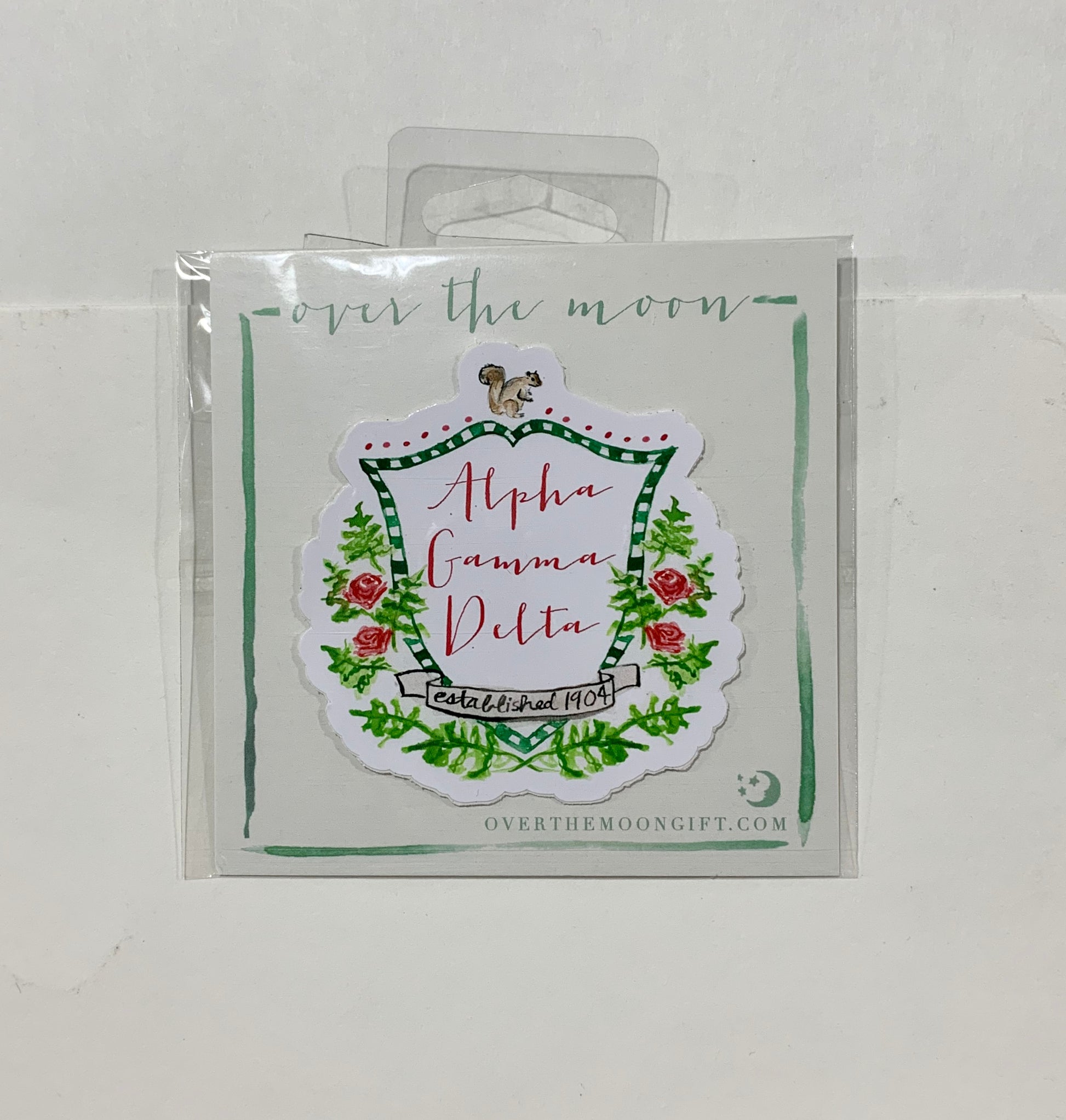 The vinyl decal features a hand-drawn water colored motif design that incorporates sorority symbols and mascots in sorority colors. Dishwasher safe. Easily removable.