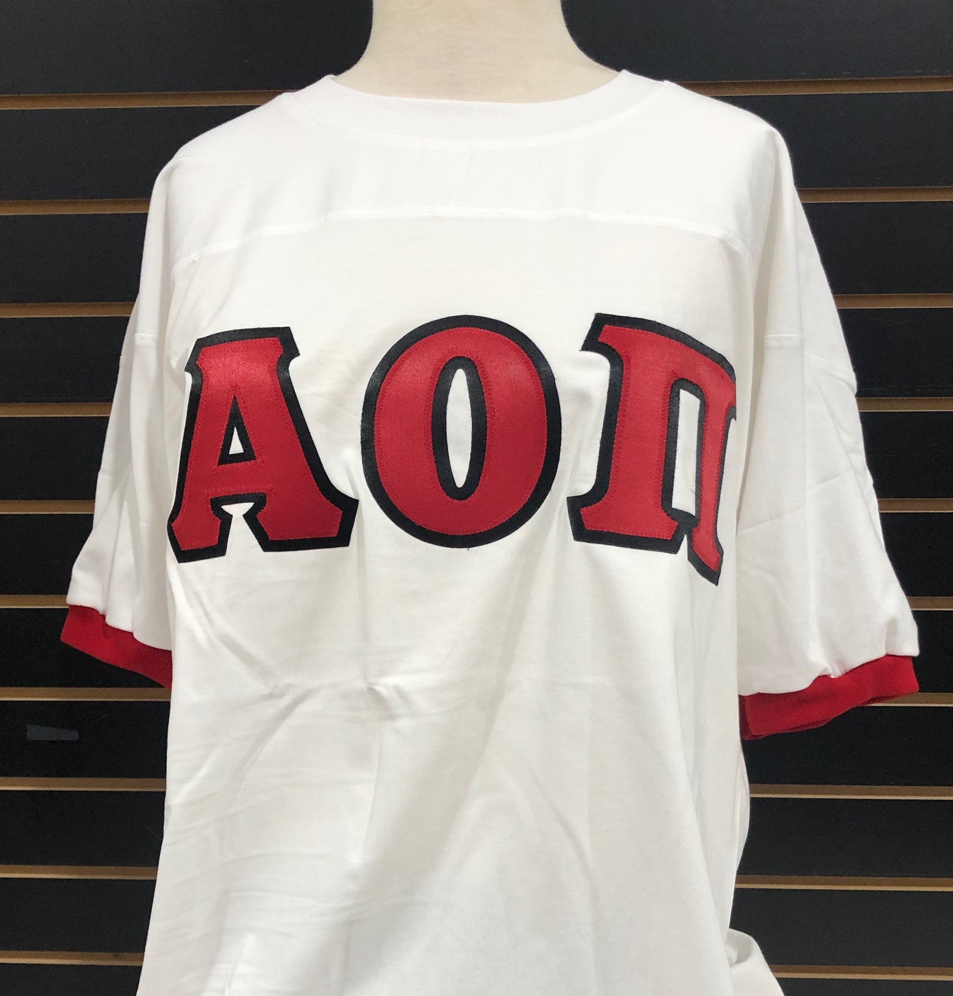 Fraternity jersey with custom sewn greek letters in your sorority colors with matching cuffs.