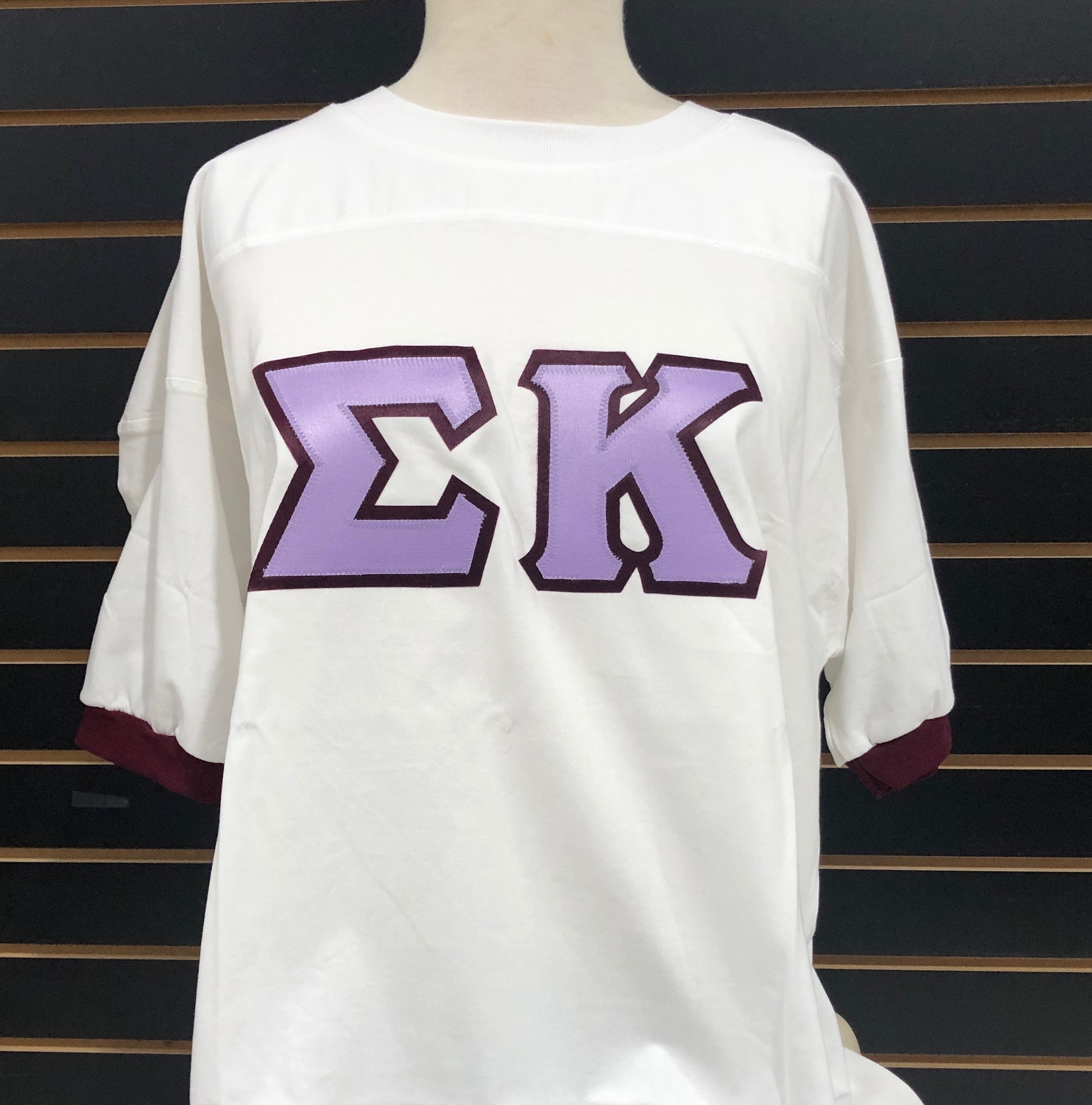Fraternity jersey with custom sewn greek letters in your sorority colors with matching cuffs.