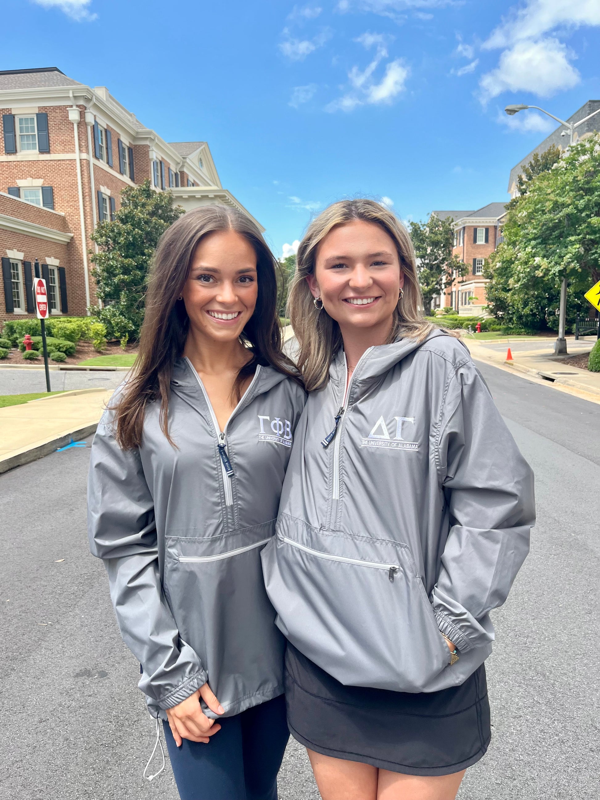 Light grey rain jacket with white monogram Greek letters and The University of Alabama underneath.